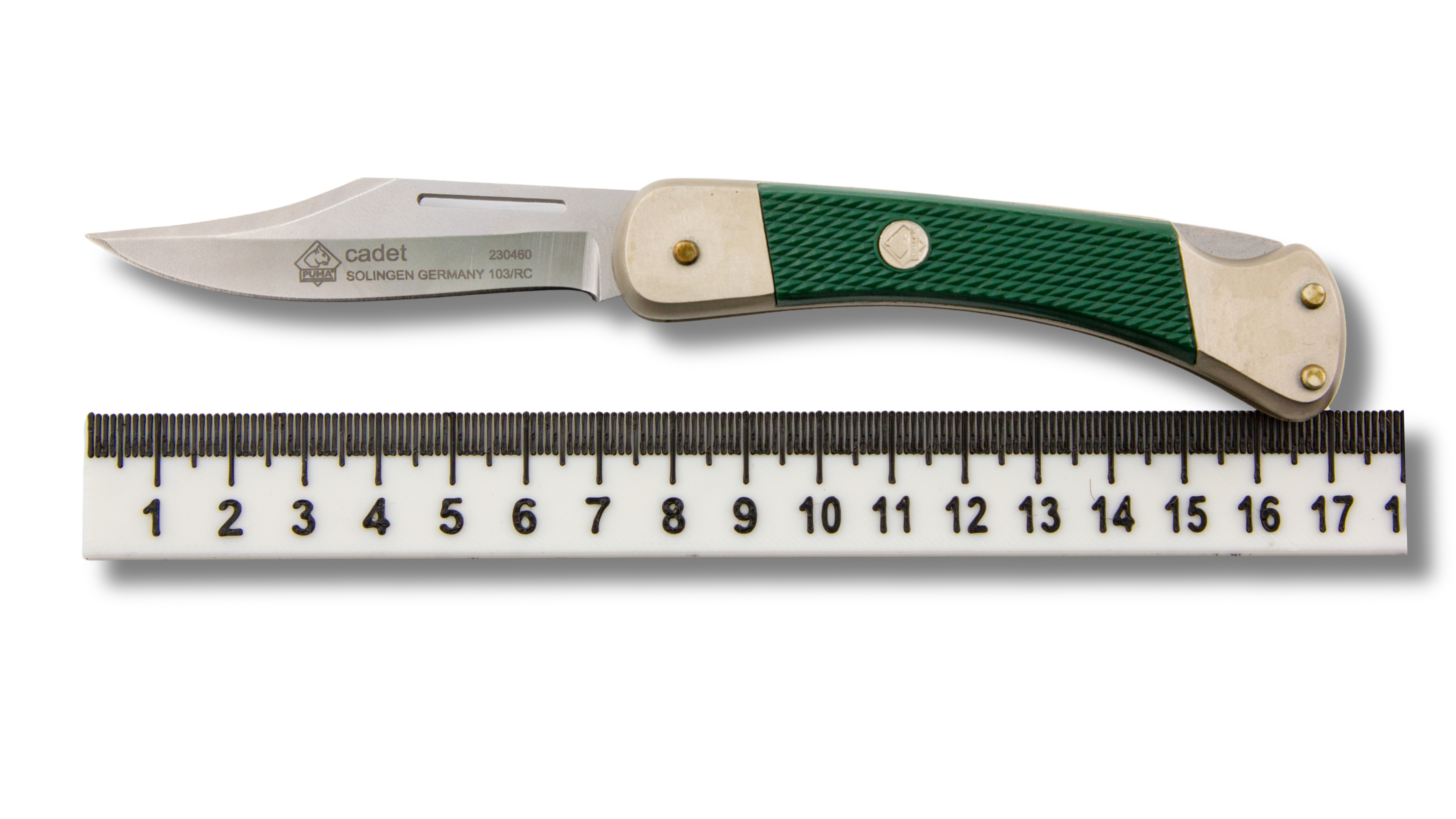 The Puma Cadet features a 2.8 inch, hollowground sandblasted 440A stainless steel clip blade. It is 6.7" overall and has a green ABS scale handle. This knife is handmade by skilled craftsmen, and the Rockwell hardness is custom proofed. The Cadet has a lifetime limited warranty.