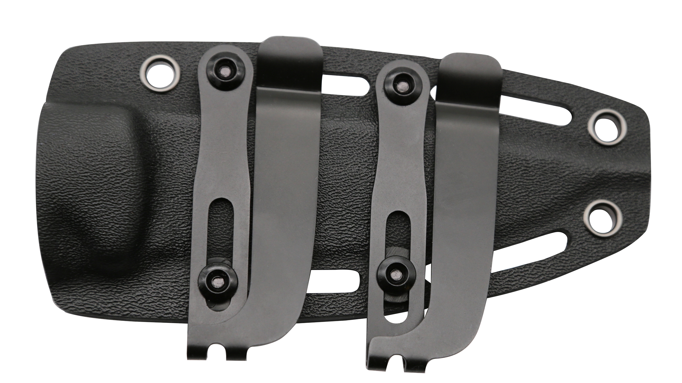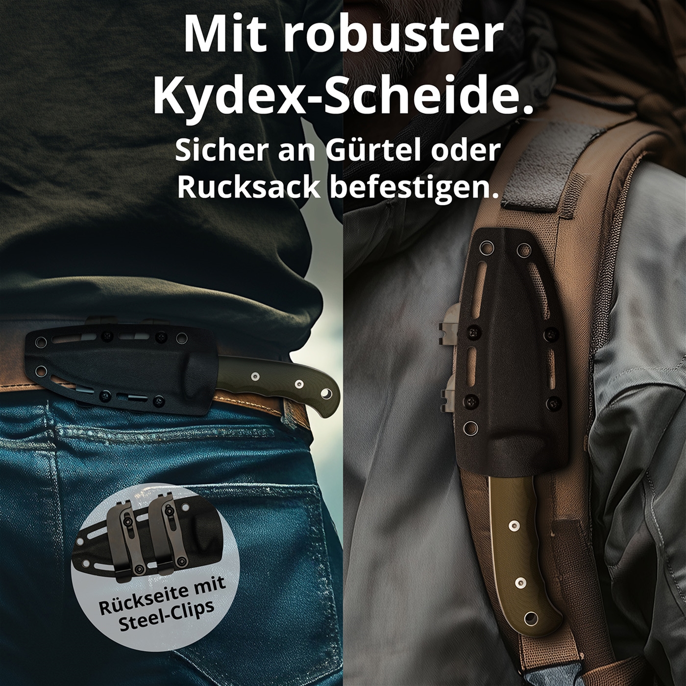 Each knife comes with a custom-fit Kydex sheath featuring steel clips for secure carrying. The sheath can be attached to your belt or gear in various ways, providing versatility and ease of use. Additionally, the integrated drainage hole prevents water buildup and simplifies cleaning. Whether by the campfire or deep in the wild, this knife is a reliable companion, blending strength, style, and functionality for any situation.