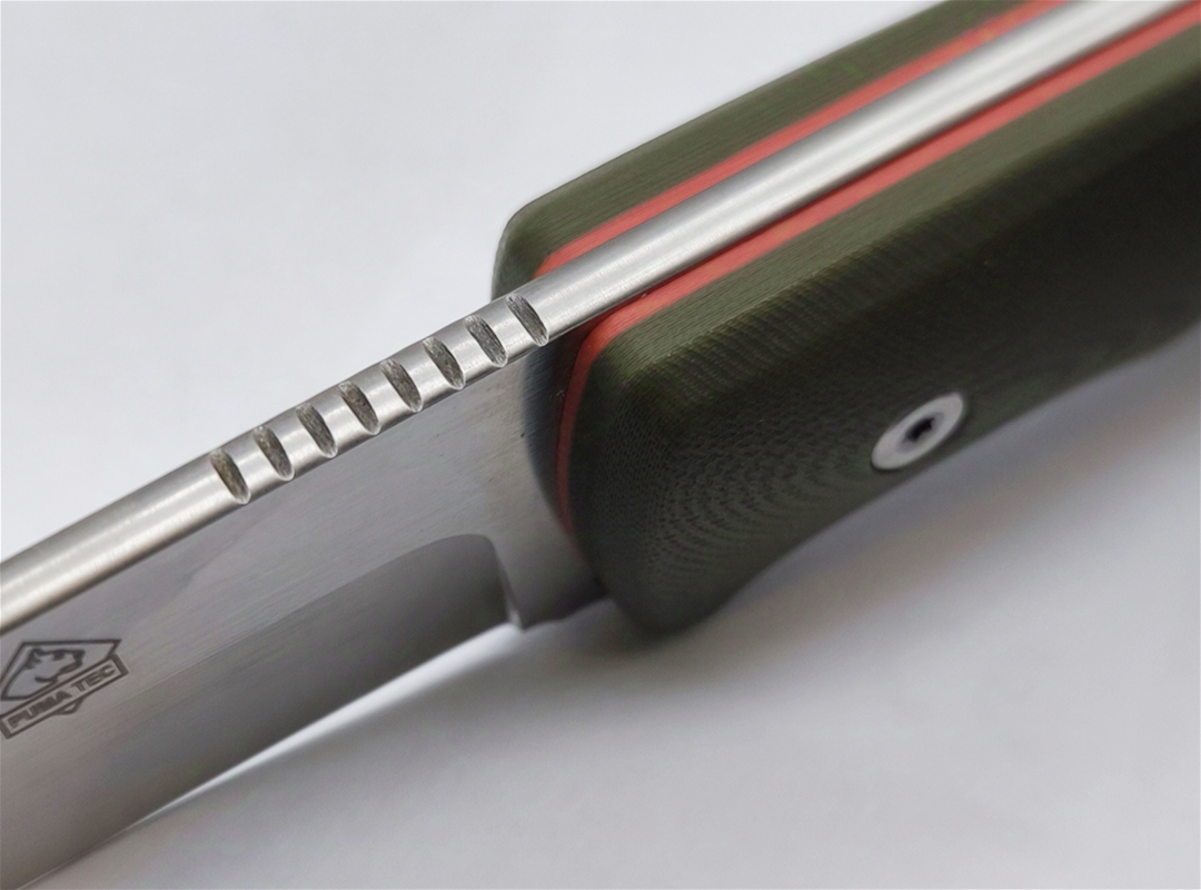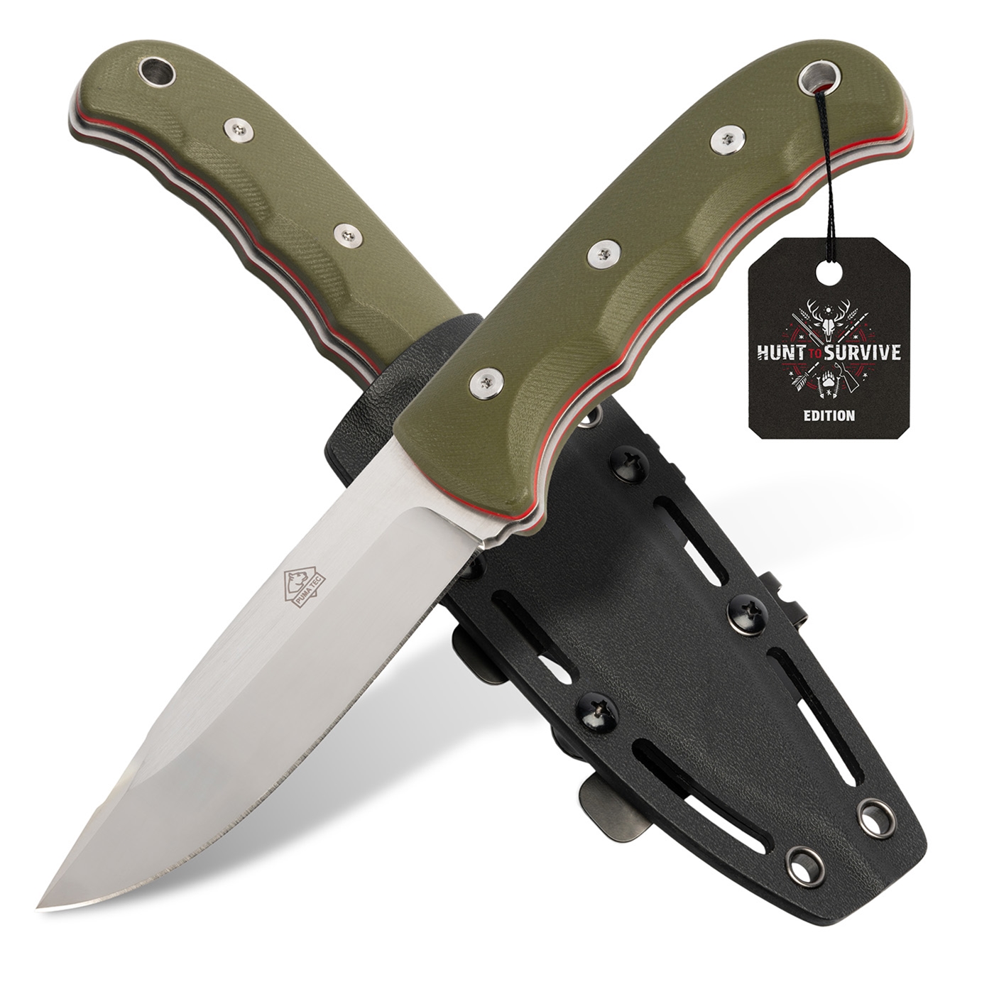 Discover the ultimate companion for your next outdoor adventure! This powerful full-tang knife stands out with its rugged appearance and thoughtful design. The handle, made of green G10 with a red G10 liner, not only offers a distinctive look but also ensures exceptional grip and durability – even under the toughest conditions. Incl. lanyard loop to attach a lanyard. The blade, crafted from premium D2 steel with an elegant satin finish, delivers maximum cutting performance and high resistance to wear.