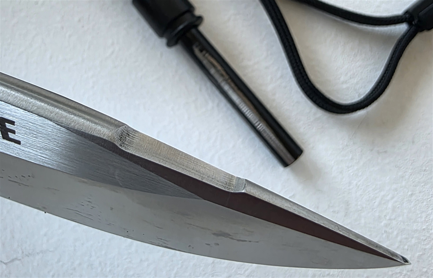 To create sparks with a firesteel (also known as a fire starter) and a knife, you will need some practice. Hold the firesteel firmly in one hand and place the sharp back of the knife blade (the recess at the front of the blade) - not the cutting edge - at an angle of about 90 degrees to the steel. Pull the knife downwards over the steel with even, strong pressure. This produces hot metal particles that fly off as sparks. Direct these sparks towards a prepared tinder nest made of dry material such as birch bark, cotton wool or dry grass.